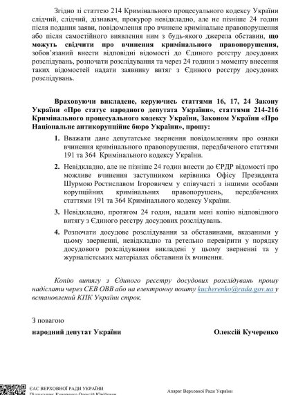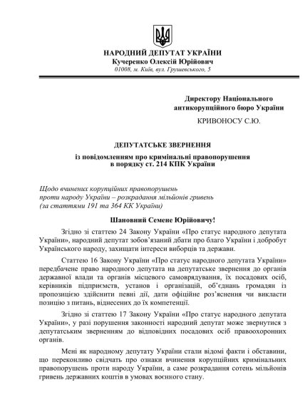 «Мне как народному депутату стали известны факты и обстоятельства, убедительно свидетельствующие о признаках совершения коррупционных уголовных правонарушений против народа Украины, а именно хищения сотен миллионов гривен государственных средств в условиях военного положения.