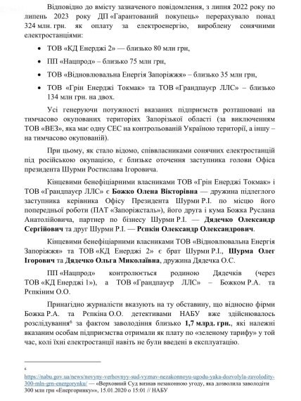 Со ссылкой на расследование проекта Bihus.info депутат указал, что с июля 2022 года по июль 2023-го ГП «Гарпок» перечислило более 324 млн грн в качестве оплаты за электроэнергию, произведенную солнечными электростанциями фирмам, принадлежащим близкому окружению Шурмы.