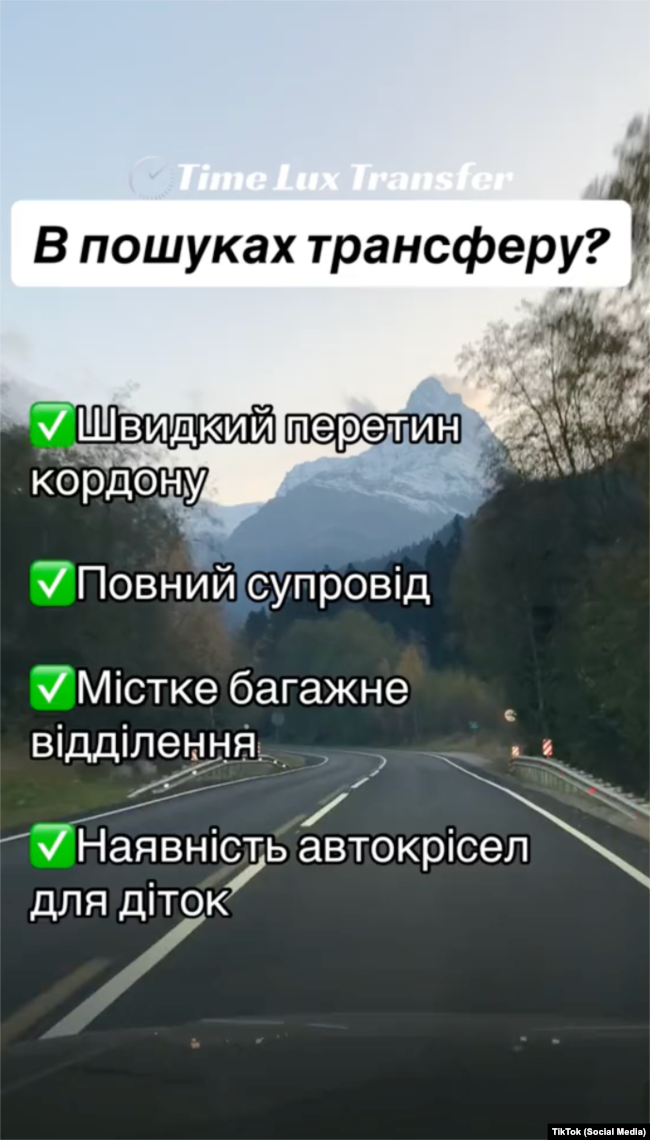 На сайті «ТаймЛюкс» зазначено, що компанія пропонує перевезення преміумкласу до Польщі, Молдови та Румунії. У рекламних роликах вони обіцяють «швидкий перетин кордону», «повний супровід» та «індивідуальні маршрути під побажання клієнта».